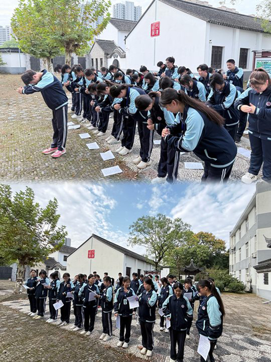 古建、園林班的班主任們則帶領班級前往古建園,開展了一次別開生面的禮儀實踐活動。學生們在古建園內互相整理儀容儀表,對著魯班像學習古人的問候行禮方式,通過親身體驗,深刻感受到了傳統禮儀文化的獨特魅力與深厚底蘊。