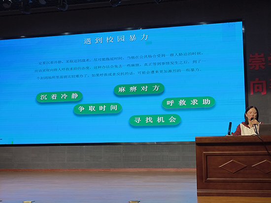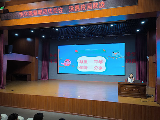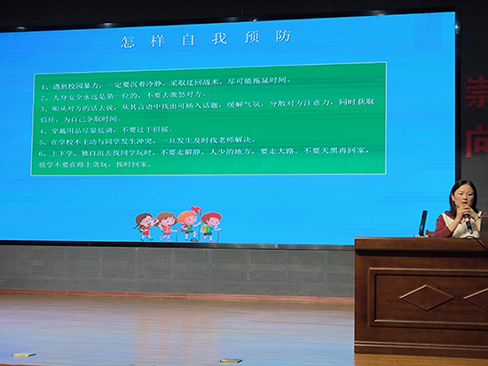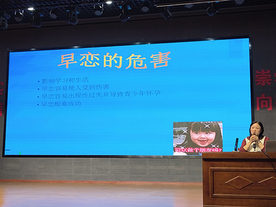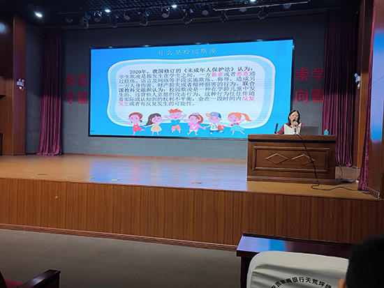 程麗霞還就早戀等因素引起的校園欺凌現象進行簡要闡述。如什么是校園欺凌、什么樣的孩子易成為欺凌者、受害者的主要類型、遇到校園欺凌怎么辦及怎樣自我預防等。