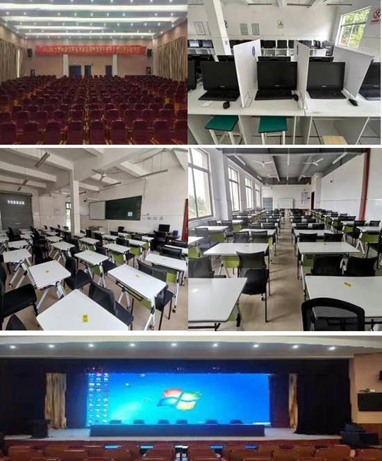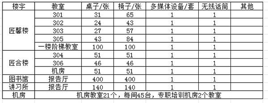學(xué)校共有專用多媒體培訓(xùn)教室12個(gè),其中200人以上多功能培訓(xùn)教室5個(gè),機(jī)房21個(gè),共計(jì)電腦1050臺(tái),其中專職培訓(xùn)機(jī)房2個(gè),同時(shí)可開(kāi)展10個(gè)班次培訓(xùn)。
