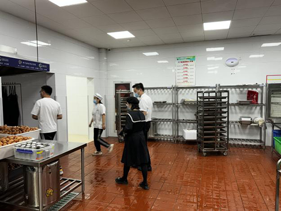 兩位家長(zhǎng)步入食材儲(chǔ)藏區(qū),映入眼簾的是各類食材按部就班,分區(qū)擺放,新鮮蔬菜綠意盎然,肉類冷凍鎖鮮,干貨整齊排列,一切細(xì)節(jié)無(wú)不透露著嚴(yán)謹(jǐn)與專業(yè)。廚房?jī)?nèi),工作人員身著潔凈制服,佩戴口罩與帽飾,動(dòng)作嫻熟而高效,洗切備料一氣呵成。