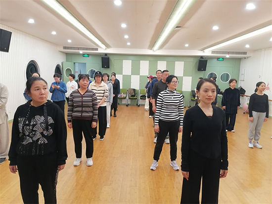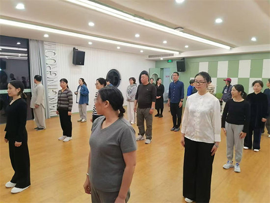 王連生老師示范了一遍楊氏太極拳的動(dòng)作,輕盈的步伐,行云流水般流暢的動(dòng)作引來(lái)學(xué)員們的掌聲。在老學(xué)員的分解動(dòng)作示范下,新學(xué)員們紛紛擺開(kāi)架勢(shì),開(kāi)始練習(xí)。由于場(chǎng)地有限,更多的學(xué)員通過(guò)線上直播課程在家學(xué)習(xí)。如果學(xué)員們現(xiàn)場(chǎng)沒(méi)有掌握好,可以回家在線上看課程回放。