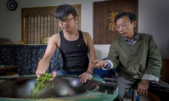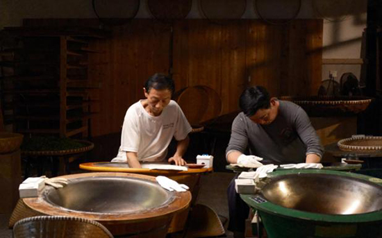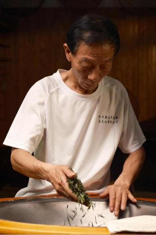 樊生華活到老,學到老。14歲學炒茶,20歲正式“出道”的他與西湖龍井打了一輩子交道。西湖龍井以色綠、香郁、味甘、形美“四絕”聞名天下。嫩綠光潤的龍井茶葉倒進光亮的鐵鍋,一雙長有老繭的手熟練地在200多度高溫的鍋中輕重有度地揉搓著,手腕輕輕抖動,抖、搭、搨、捺,茶葉在手掌心翻轉、跳躍。不一會兒,清新的龍井茶香就彌漫開來。