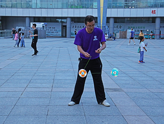 “健”入社區,福惠居民。“抖空竹”運動,在校園實施的同時,江禮軍帶著他的團隊把空竹運動帶入了社區,利用業余時間、節假日以及傳統節日在社區開展“抖空竹”活動,定海公園、海濱公園、海山公園、柳永廣場、文化廣場等多個群眾聚集的文化休閑場所都有空竹的身影。空竹在老師手中仿佛被賦予了鮮活的生命,一連串的招式讓居民大開眼界,在練習時掉在地上,大家并不氣餒,不停的嘗試,找竅門,一遍又一遍的實踐,在歡聲笑語中,社區居民享受空竹藝術帶來的無窮魅力和健康和快樂,勞逸結合,豐富大家的業余生活,同時也有效地激發了大家對空竹的興趣。