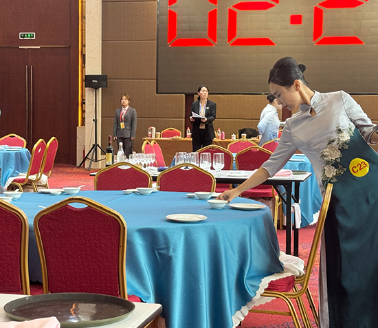 比賽歷時(shí)兩天,全省共有11個(gè)地市31名旅游專業(yè)教師參賽。比賽過程中,趙瑩老師均能穩(wěn)定發(fā)揮,并在中餐宴會(huì)擺臺(tái)環(huán)節(jié)中,以流暢的操作、規(guī)范的服務(wù),展現(xiàn)了出色的職業(yè)素養(yǎng)與專業(yè)技能。