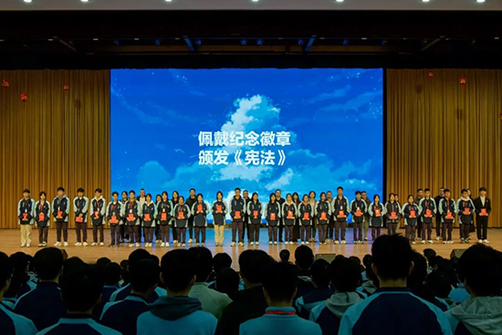 作為學校成人禮的必要環(huán)節(jié),在場的老師和家長代表為學生代表發(fā)放《中華人民共和國憲法》并佩戴上了紀念徽章。全場同學握舉右拳,在學生會主席機電224班項云龍同學的帶領下,許下了堅定的成年誓言。(浙江信息工程學校)