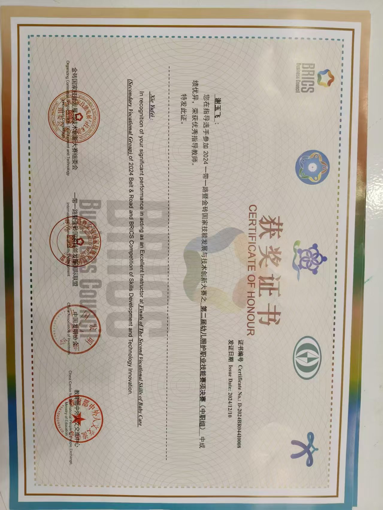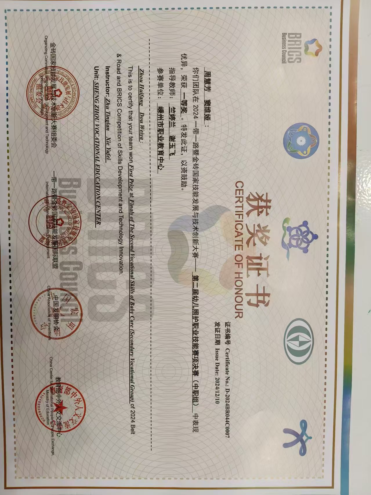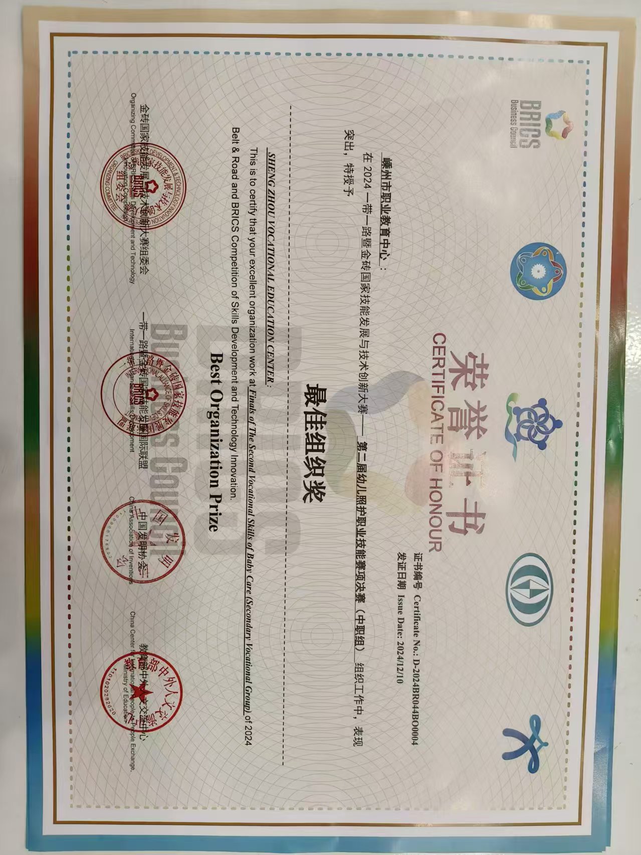 12月10日,2024年一帶一路暨金磚國家技能發(fā)展與技術(shù)創(chuàng)新大賽第二屆幼兒照護(hù)賽項(xiàng)決賽成績公布,嵊州市職教中心23保育大專班竇唯婭、周慧芳兩位同學(xué)組成的團(tuán)隊(duì)成功斬獲全國一等獎,并將獲得1+X幼兒照護(hù)高級證書;竺婷蘭、謝玉飛被評為優(yōu)秀指導(dǎo)教師;嵊州市職教中心獲“最佳組織獎”。