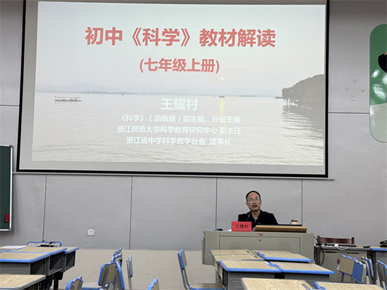 面對新教材,如何正確解讀并有效應(yīng)用成為教師們關(guān)注的焦點。活動伊始,浙江師范大學(xué)科學(xué)教育研究中心副主任王耀村老師對新教材進(jìn)行了總體解讀,他強(qiáng)調(diào)《科學(xué)》教材修訂旨在落實立德樹人的根本任務(wù),依據(jù)課程方案和課程標(biāo)準(zhǔn),遵循教育規(guī)律和學(xué)習(xí)規(guī)律,同時強(qiáng)化課程育人的目標(biāo)。長興縣初中科學(xué)教研員戴中儉通過對比新老教材,從目標(biāo)調(diào)整、板塊調(diào)整、課程標(biāo)準(zhǔn)要求、分章節(jié)詳解四個方面對新教材第二章進(jìn)行了深入解讀。長興縣龍山中學(xué)高偉老師針對第三章的基本要求、知識進(jìn)行了系統(tǒng)梳理,并提出了一系列有效的教學(xué)建議。長興縣煤山中學(xué)吳健老師從章節(jié)、內(nèi)容、板塊、資源等多個維度對第四章內(nèi)容進(jìn)行了詳細(xì)講解。長興縣實驗初中沈國慶老師則從課標(biāo)解讀和教材分析兩個方面對第五章進(jìn)行了全面介紹,并通過《自制天平》和《制作一把可以秤液體密度的桿秤》兩個教學(xué)案例,使學(xué)員對如何上好技術(shù)與工程的課型有了更清晰的認(rèn)識。