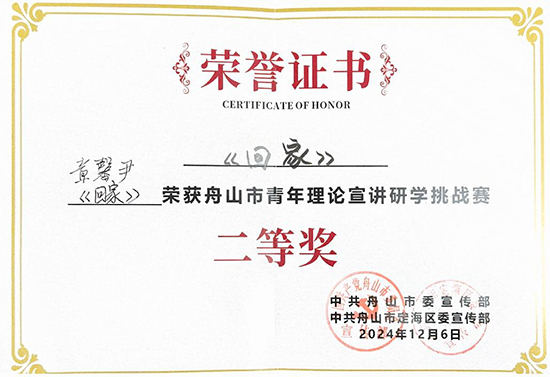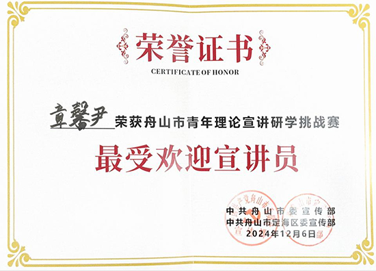 12月6日下午,舟山市青年理論宣講研學(xué)挑戰(zhàn)賽決賽在定海區(qū)干石覽鎮(zhèn)新建村鄰里中心舉行。舟山職業(yè)技術(shù)學(xué)校(舟山技師學(xué)院)青年宣講員章馨尹所在團(tuán)隊(duì)最終獲得二等獎(jiǎng),其本人獲評(píng)“最受歡迎宣講員”。