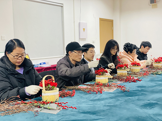 活動現場,繁花似錦,香氣氤氳。“插花的方式和你所選的花材、花瓶都有關,搭配上切忌喧賓奪主……”花藝老師首先給大家講解了插花的技巧、種類、顏色搭配及養護方法,并現場演示了制作過程。居民們圍坐在一起,認真聆聽,邊學邊練。在花藝老師的悉心指導下,大家迫不及待地拿起剪刀和花材,將手中的花朵精心剪裁、巧妙組合,康乃馨、臘梅、銀柳等幾種花卉在高低錯落間盡顯熱鬧與生機,匯聚成一個個美麗的花籃。現場氣氛活躍,居民們相互交流,鮮花與笑容交相輝映,充滿了溫馨與歡樂。參加活動的居民李阿姨笑著說:“這是我第一次參加插花活動,感覺特別新鮮有趣。”