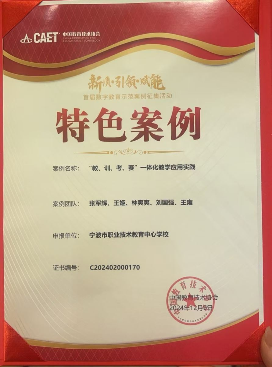 近日,寧波市職業技術教育中心學校在由中國教育技術協會主辦的首屆數字教育示范案例征集活動中,報送的《“教、訓、考、賽”一體化教學應用實踐》案例榮獲特色案例獎。這一榮譽標志著學校在網絡安全現場工程師培養方面的創新實踐得到了廣泛認可。