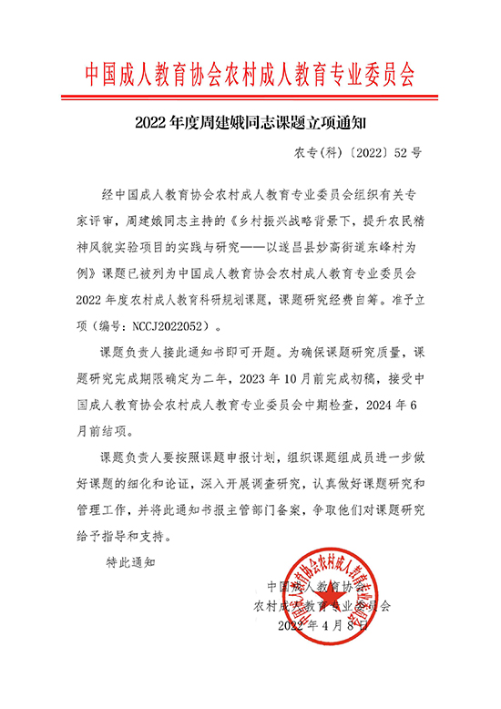 近日,遂昌中心成技校周建娥主持在2022年4月立項的全國農村成人教育科研規劃課題《鄉村振興戰略背景下,提升農民精神風貌實驗項目的實踐與研究——以遂昌縣妙高街道東峰村為例》,通過2年實踐研究,經中國成人教育協會農村成人教育專業委員會組織專家評審,已成功結題。