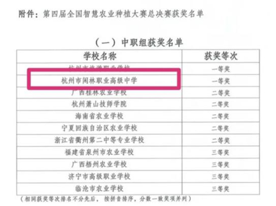 為推動數字農業(yè)、智慧農業(yè)在農業(yè)職業(yè)教育教學改革中的應用創(chuàng)新,推進“崗課賽證”融通育人模式,培養(yǎng)高素質高質量農業(yè)技術技能人才。中國農業(yè)出版社有限公司、中國職教學會現代農業(yè)職業(yè)技術教育專業(yè)委員會、中國都市農業(yè)職業(yè)職教集團、中國現代農業(yè)裝備職教集團和四維生態(tài)科技(杭州)有限公司共同舉辦的第四屆全國職業(yè)院校智慧農業(yè)種植大賽,本次比賽全國共有76所院校參賽,每支參賽隊由3名學生組成。閑林職高在比賽中獲得一等獎。(杭州市閑林職業(yè)高級中學)