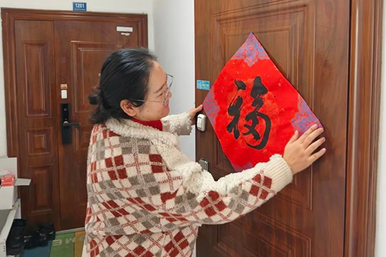 為了這場新年拜訪,學(xué)校方志堅(jiān)書法工作室的師生們特地書寫了對聯(lián)和福字,期許為阿姨家?guī)バ履甑姆諊?/p>