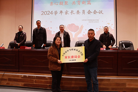 陳順宇授“2024學(xué)年玉環(huán)市中等職業(yè)技術(shù)學(xué)校家長(zhǎng)委員會(huì)”牌。