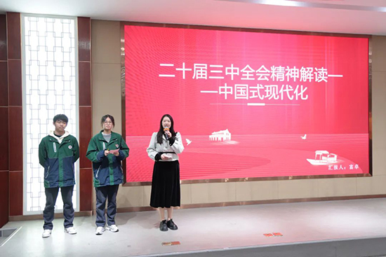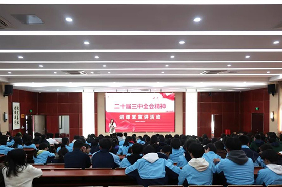 11月29日中午,由學(xué)校師生代表組成的宣講團(tuán),在樂學(xué)樓鼎建報告廳為全校師生帶來了一場關(guān)于二十屆三中全會精神的精彩宣講。校黨委書記范曉春、副校長龔磊出席活動,黨政辦副主任寧文菲擔(dān)任活動主持人。活動設(shè)主會場和分會場,主會場班級學(xué)生現(xiàn)場聆聽宣講,分會場班級學(xué)生在教室觀看直播。