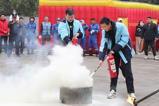 實操演練強技能,攻防并舉筑防線。消防安全逃生演練后,消防實操演練正式開始,藍天救援隊專業人員講解示范滅火器的操作要點,以及現場逃生屋的體驗,在他們的指導下,學生代表、教師代表、寢室宿管員、保安、食堂工作人員、超市工作人員輪番上陣,開展實操演練。通過親身體驗掌握滅火器的正確使用方法,和安全屋模擬火災現場的煙霧環境,真正做到將理論強化于心,將技能熟練于行。