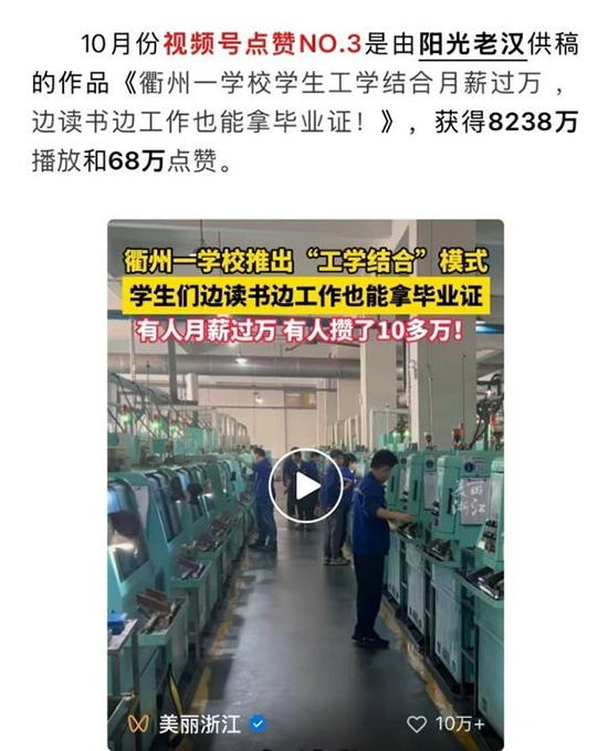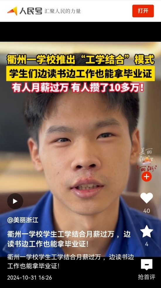 近日,潮新聞發布的《衢州這所學校“工學結合”模式結出碩果,學生邊讀書邊工作,月薪過萬》火爆全網,上了熱搜,《人民日報》、新華網等十多家媒體爭相轉發,評論點贊超百萬,主媒體閱讀量及派生播放量已經過億,絕大多數都在贊美浙江、贊美衢州、贊美企業、贊美學校、贊美這種培養人才的模式,各路專家、博主也紛紛出來發言,認為值得全國推廣。是何方神圣如此勁爆網民?網民熱捧的背后究竟有何等驚人的秘密?讓我們一起來看看江山高級技工學校推行“工學一體,雙元雙導,德技雙馨”人才培養模式的前世今生。