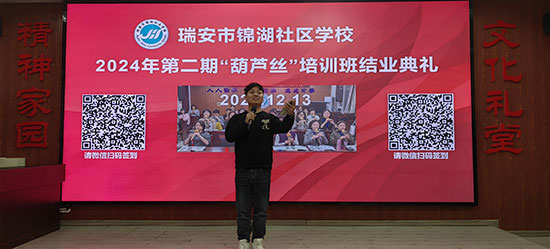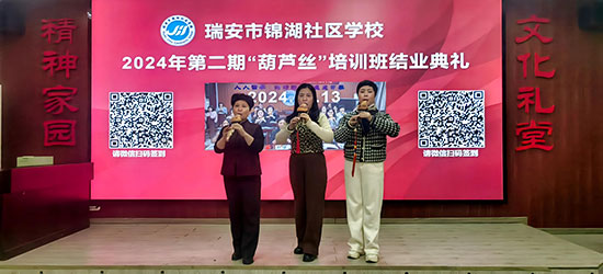 隨著最后一個音符落下,本期葫蘆絲培訓正式畫上圓滿句號。這場結業典禮不僅是對學員們學習成果的肯定,更是對他們未來藝術之路的美好期許。相信在瑞安市錦湖社區學校的大力支持和劉明明導師的專業引領下,這些熱愛葫蘆絲藝術的學員們將繼續在音樂的道路上砥礪前行,創造更加輝煌的成績,為葫蘆絲藝術的傳承與發展注入新的活力。(張再益)