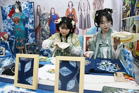 在動態展示環節中,兩位身穿漢服的花樣專業學生現場展示了手工刺繡技藝,將花樣專業課的實踐教學成果生動呈現給觀眾。這一環節不僅增強了展覽的互動性和觀賞性,也讓參觀者更加直觀地感受到了職業教育的活力和魅力。手工刺繡的細膩與精美吸引了眾多目光,成為活動現場的一大亮點。