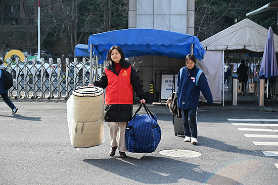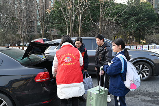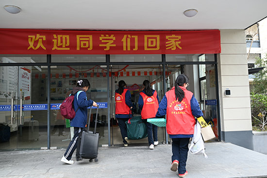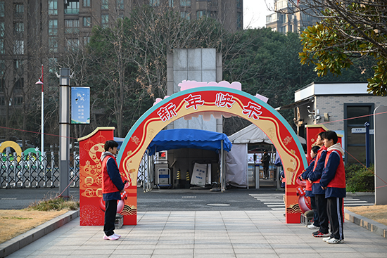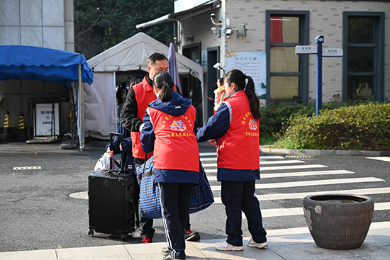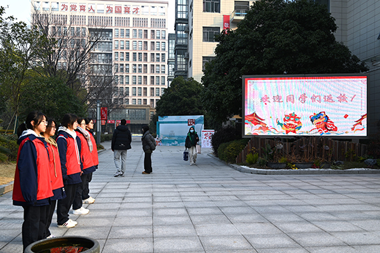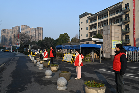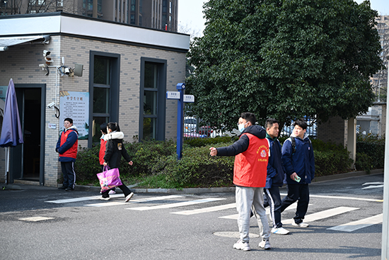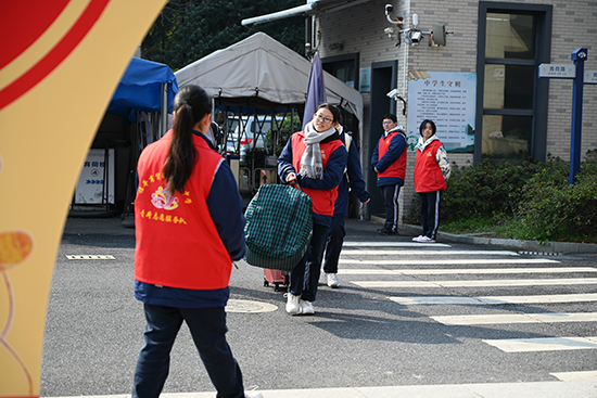 師生志愿者在各自崗位為家長們、同學們熱情服務,“紅馬甲”成了校園一道亮麗的風景線。