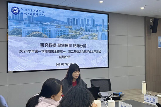 在會議第二項議程,浙江信息工程學校副校長陸婷結合本校實際,對2024學年第一學期期末全市高一、高二基礎文化課學業水平測試情況進行了詳細分析匯報。陸婷從本校統測整體情況、各年級不同類型班級語數英三科的整體情況、典型分析等多個維度進行數據研究、靶向分析,充分挖掘出在班級、學科、教師、學生各個層面在數據背后隱藏的問題,并針對性地提出下階段提升教學質量的重點工作舉措,明確將協同教研組、專業部、班主任與任課教師推進各項舉措的落實。