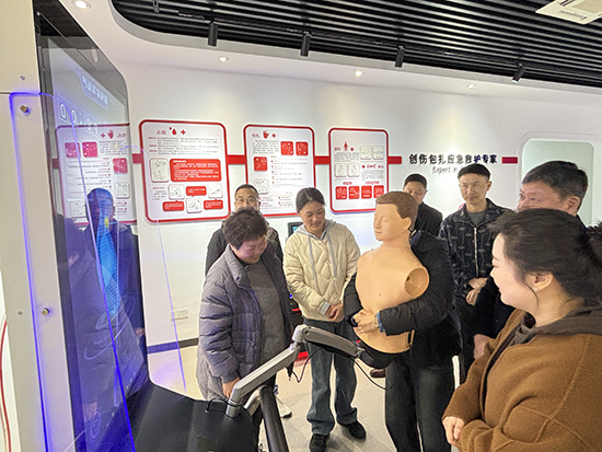 隨后,考察團領導重點參觀了學校特色內容之一——生命安全體驗館。在體驗館內,考察團成員親自體驗了各種應急救護設施,深入了解學校在生命安全教育方面的創新舉措??疾靾F對昌碩分院在培養學員生命安全意識、提高自救互救能力方面取得的成果給予了高度評價。