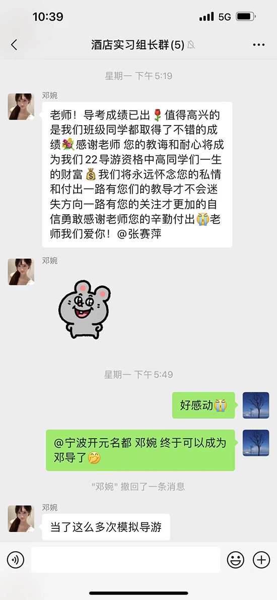 “老師!導考成績已出,我們班同學都取得了不錯的成績。感謝您,您的教誨和耐心將成為我們一生的財富,我們愛你!”看到成績的那一刻,學生鄧婉特地在班級小群@班主任張賽萍老師,代表全班同學報佳音。