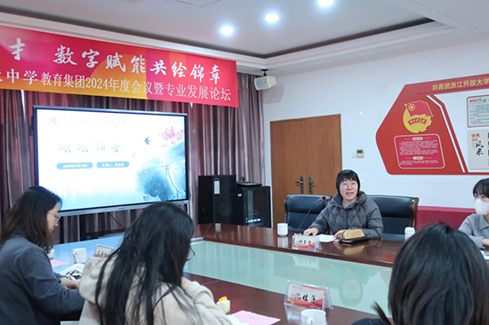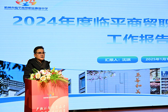 集團理事長兼校長沈琪代表集團致歡迎辭并作2024年度教育集團工作報告。沈琪校長對長期關心和支持集團發展的教育主管部門、有關單位以及積極推進協同育人的成員單位表示衷心感謝,他從人才培養、教育教學成果、教師隊伍建設、產教融合進展、青荷育人品牌、校園安全管理等多個方面介紹了2024年度商貿職高取得的辦學成果,同時表達了對學校2025年發展之路的展望。