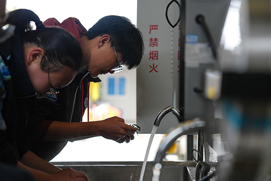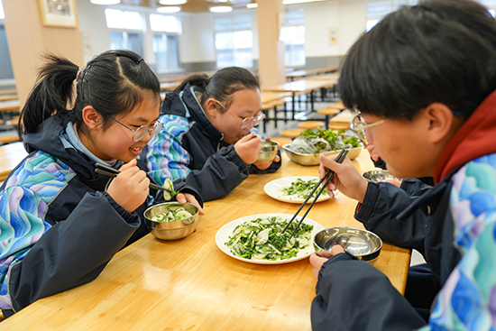采挖結(jié)束,同學(xué)們手捧滿是泥土的薺菜,來(lái)到后廚分揀、清洗,制作品嘗寧波傳統(tǒng)菜肴薺菜炒年糕。從田間到餐桌,不到1個(gè)小時(shí),新鮮透骨的薺菜年糕讓同學(xué)們直呼吃得過(guò)癮。有細(xì)心的同學(xué)發(fā)現(xiàn):燒熟的薺菜仿佛變身了,從原本的暗沉無(wú)光變得青翠欲滴。