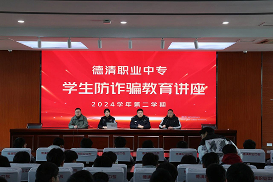 2月28日上午,德清職業中專邀請了武康派出所副所長、學校法制副校長沈家昀與德清縣公安局反詐中心的警官來校開展學生防詐騙教育講座。校黨委委員馬紀孝出席,機電專業、服裝專業等200多名學生參加。講座由政教處處長鄧志民主持。