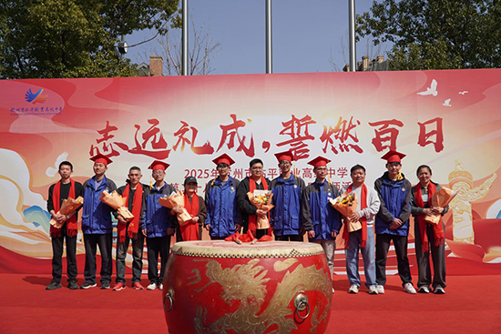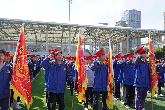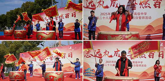 校領導及各專業部部長為高三學子們擂鼓助威,戰旗手們揮舞戰旗,帶領全體學生喊出響亮的口號。鼓聲震天,戰旗飄揚,展現了學子們迎接高考挑戰的堅定決心與昂揚斗志。青春的激情與夢想的力量交織,為百日沖刺奏響了最激昂的序曲。