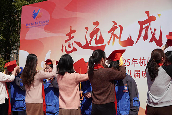 各專業部學生代表依次上臺,班主任為他們戴上象征成人的學士帽,學生們則向老師獻上鮮花,表達對師長的感恩之情。同時,全體學生戴上成人帽,象征著他們由少年正式走向成年。