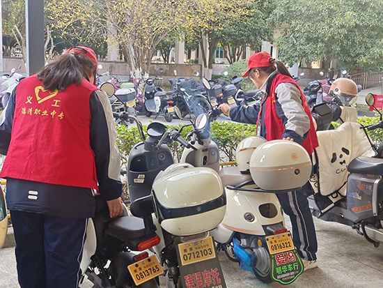 志愿者們的那一件件紅背心在陽光下顯得格外耀眼,如同一抹亮麗的“中國紅”。他們來到電動車和自行車車棚,對不規范停放的車輛進行有序整理,讓車子“歸位”,讓校園文明“到位”。