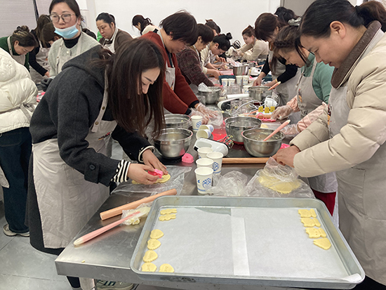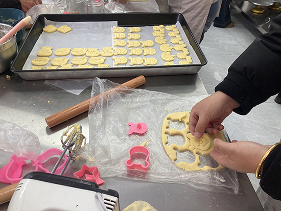 活動(dòng)現(xiàn)場,烘焙教室變身“創(chuàng)意工坊”。教師楊晹從餅干面團(tuán)調(diào)配、模具使用技巧到烘焙溫度控制逐一講解,并重點(diǎn)示范了卡通餅干的制作流程。學(xué)員們選用小兔、花朵、love等造型模具,將面團(tuán)壓制成形態(tài)各異的卡通圖案。大家邊學(xué)邊做,互相交流創(chuàng)意,現(xiàn)場氣氛溫馨熱烈。經(jīng)過烘烤,一盤盤金黃酥脆、造型生動(dòng)的卡通餅干新鮮出爐,學(xué)員們紛紛舉起作品拍照留念,成就感滿滿。