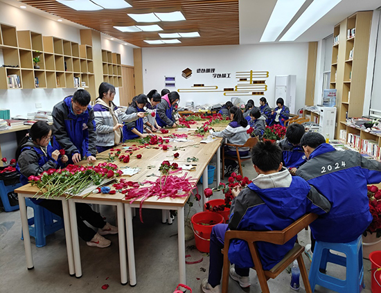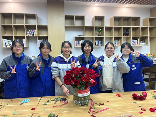 在臨平職高校園,全體女老師溫暖如春日的陽光,是她們的溫柔明媚驅散了學生心頭的陰霾,是她們的智慧堅強鼓勵著學生勇敢追尋屬于自己的光。校園處處充滿了愛與關懷,這份沉甸甸、無私奉獻的愛,深深打動著每一位臨職學子的心。來自計算機部數媒專業2419班的同學們,在趙櫻俊老師的帶領下,利用課余時間為老師們包裝玫瑰花等禮物,他們用行動詮釋對老師的熱愛與感恩,也是2419班送給全體臨職女教師的特殊禮物。
