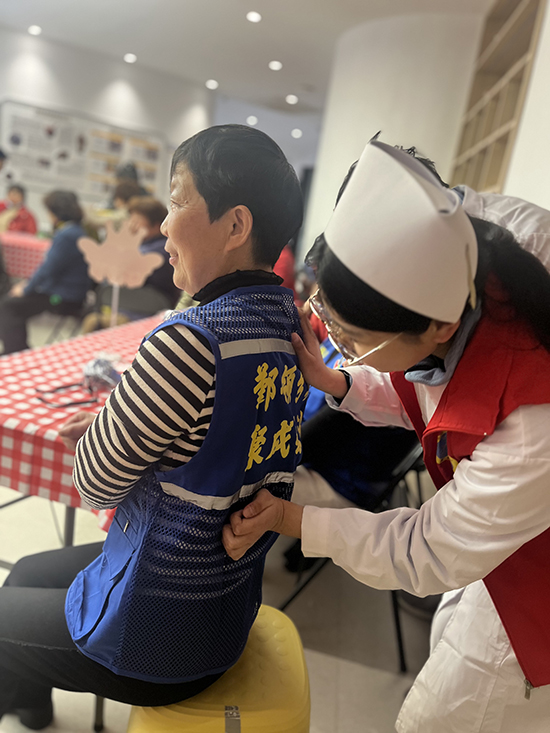 現(xiàn)場,圍繞與生活息息相關(guān)的養(yǎng)老康復(fù)主題,同學(xué)們發(fā)揮專業(yè)所學(xué),為居民普及知識、傳授技能。大家各有分工,彭馨慧負(fù)責(zé)解腰肌勞損、肩周炎預(yù)防及治療宣講。其他同學(xué)或演示肌肉推拿,或走到居民身邊,手把手指導(dǎo)傳授正確手法。隨后,同學(xué)們?yōu)榫用駵y量血壓和血氧,并把制作好的中藥包贈予大家。