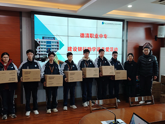 3月7日,建設銀行德清支行副行長王佳麗一行到訪德清職業中專,開展“助學送關愛”主題活動,為20名學子發放慰問物資并舉行座談。校政教處處長鄧志民、教務處副處長夏溢敏出席接待。