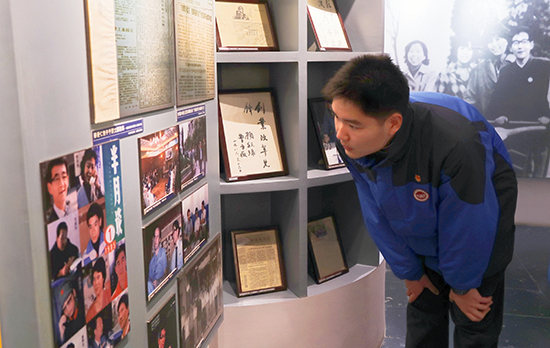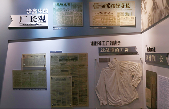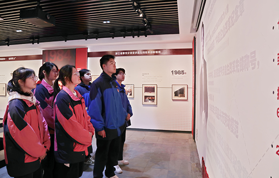 師生在講解員的引導(dǎo)下有序參觀。陳列館內(nèi),一幅幅珍貴的歷史照片、一件件承載著時(shí)代記憶的實(shí)物展品、一段段生動(dòng)詳實(shí)的影像資料,生動(dòng)再現(xiàn)了步鑫生在改革開放初期,以非凡的勇氣和魄力,打破舊有體制機(jī)制束縛,推動(dòng)海鹽襯衫總廠走向輝煌的奮斗歷程。