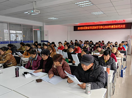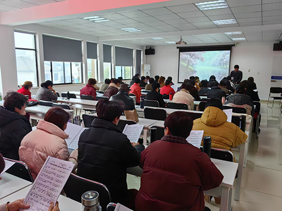 近日,走進(jìn)安吉縣社區(qū)教育學(xué)院靈峰學(xué)習(xí)中心(靈峰成校)的教室,悠揚(yáng)的歌聲便縈繞耳畔。53名歌詠班學(xué)員正跟著宋雪東老師,認(rèn)真學(xué)唱著云飛的《永遠(yuǎn)的贊歌》。