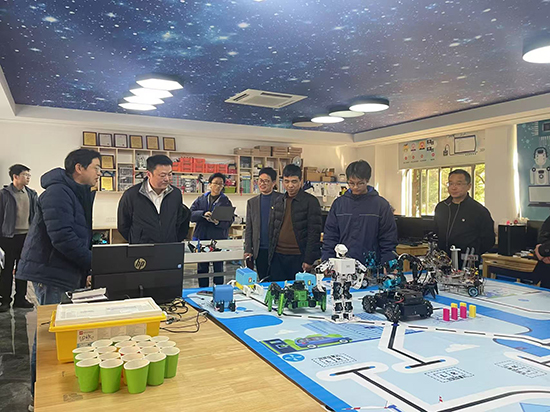 宣講結束之后,浙建院領導一行饒有興致地參觀了上虞職教中心天工智造創客基地。上虞區教育體育局黨委委員、副局長劉炯炯陪同參觀。