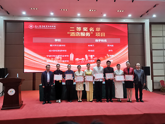 3月22日,2025浙江省中等職業學校職業能力大賽酒店服務賽項在浙江商業職業技術學院落下帷幕。來自全省11個地市的22支隊伍、44名選手同臺競技,嘉興市交通學校(嘉興交通技工學校)王贏芬、蔡虹老師指導的肖博文、賈尚鵬選手憑借扎實的專業技能與出色的臨場發揮,榮獲團體二等獎(全省第三名),為學校再添榮譽。