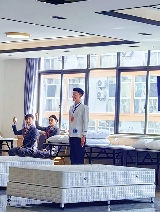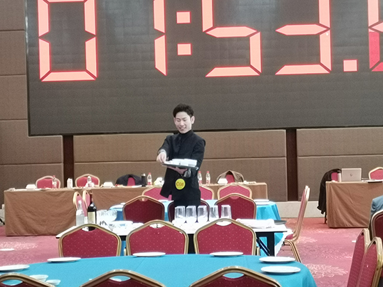 本次比賽遵循國賽標準,實行團體賽制,每隊兩名選手分工合作:一人負責餐廳服務,另一人完成前廳接待與客房中式鋪床。比賽不僅考察操作規范性和熟練度,還檢驗語言表達、應變能力、服務意識及心理素質等職業素養。比賽中,賈尚鵬與肖博文沉著冷靜,自信迎接挑戰。前廳接待環節展現專業溝通能力與業務知識;客房服務項目中,他們以精湛操作和對細節的嚴格把控,打造整潔舒適的客房;餐具擺放精準迅速,臺布鋪設平整無褶,餐巾折花藝術氣息濃厚。每個細節處理得當,動作專業優雅,充分展示酒店藝術與魅力,贏得了評委認可。