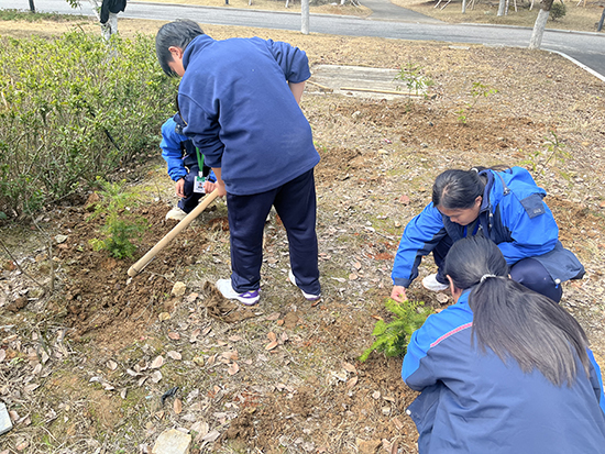 園林專業學生化身“綠色工程師”,運用土壤改良知識為樹苗“安家”。16株承載專業智慧的樹苗錯落栽下,枝頭掛滿學生手寫的生態心愿卡——“愿十年后與母校共賞此樹花開”。
