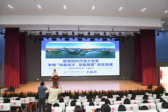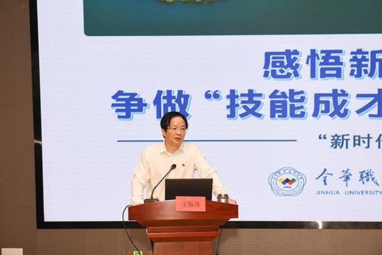 金華職業技術大學黨委書記王振洪以《感悟新時代偉大變革 爭做“技能成才、技能報國”的實踐者》為題,為大家帶來一場“新時代變革實踐”主題宣講,分享了新時代我國、我省、我市取得的偉大成就,金華職業技術大學深耕職教、扎根八婺的辦學情況,以及職業教育助力青年學子圓夢的金彩故事,展現了新時代青年成長的無限可能。他提到,金華實驗中學虞婧雯同學以全國職業技能大賽一等獎、浙江省單獨考試第一名的優異成績叩開金職大職業本科大門,以“技能+素養”雙優實力證明職教賽道是成就夢想的黃金通道,并以此勉勵學子以技能為舟、以匠心為帆,在時代浪潮中書寫技能報國的青春答卷。