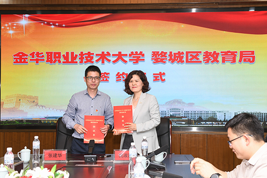 隨后,婺城區教育局與金華職業技術大學舉行合作簽約儀式。在與會嘉賓見證下,張建華局長與金職大教務處處長倪淑萍簽署合作協議,雙方正式建立全方位、深層次的戰略合作。未來,雙方將攜手搭建“課程銜接、師資共享、實訓聯動“的長效機制,努力打造區域中高職一體化示范案例,深入推進婺城區教育事業的高質量發展。