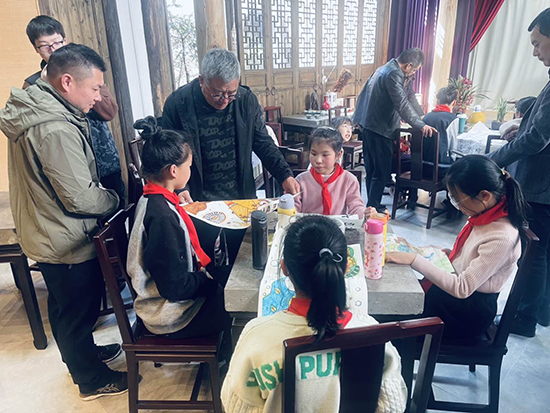 顏景龍了解了在座學生的大致情況后,面對不同年齡的學生,用通俗易懂的話語,侃侃而談“興趣”“想象”“美丑”“信心”在書畫創作中的重要性。顏景龍循循善誘:兒童畫是一種想象,是理想、幻想與現實的結合,隨意發揮,不用臨摹的,11與12歲前可天馬行空表達自己的想法,畫畫、寫字是一種天賦。年紀大學習要花工夫,形成美育的認知。美、丑是兩極概念,畫畫、寫字沒有對與錯、好與壞之分。如早上、晚上的太陽是紅紅的,暖暖的;中午的太陽是白色的,冷冷的,怎么能分出哪個時候的太陽美與丑?畫、字是點、線、面的結合。事物的正確認識是一種形象概念。沒有好與不好,只要有興趣,觀察事物,認真思考形成自己的點、線、面,畫出自己的心中的內容即可;要增強信心,要有自己獨到的想法。兒童畫是沒有可比性,只要畫一定能畫好的。楓橋鎮中心學校教導主任駱金揚:勉勵學生運用自己的心、筆畫出自己心中的模樣。