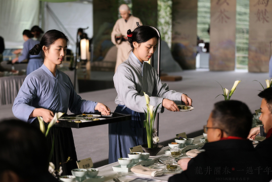 斗茶交流活動組協助評審流程,近距離學習專家對60余種西湖龍井茶樣的品鑒技巧,并參與臺灣高山烏龍茶的品飲服務,深入體會兩岸茶藝的異同。