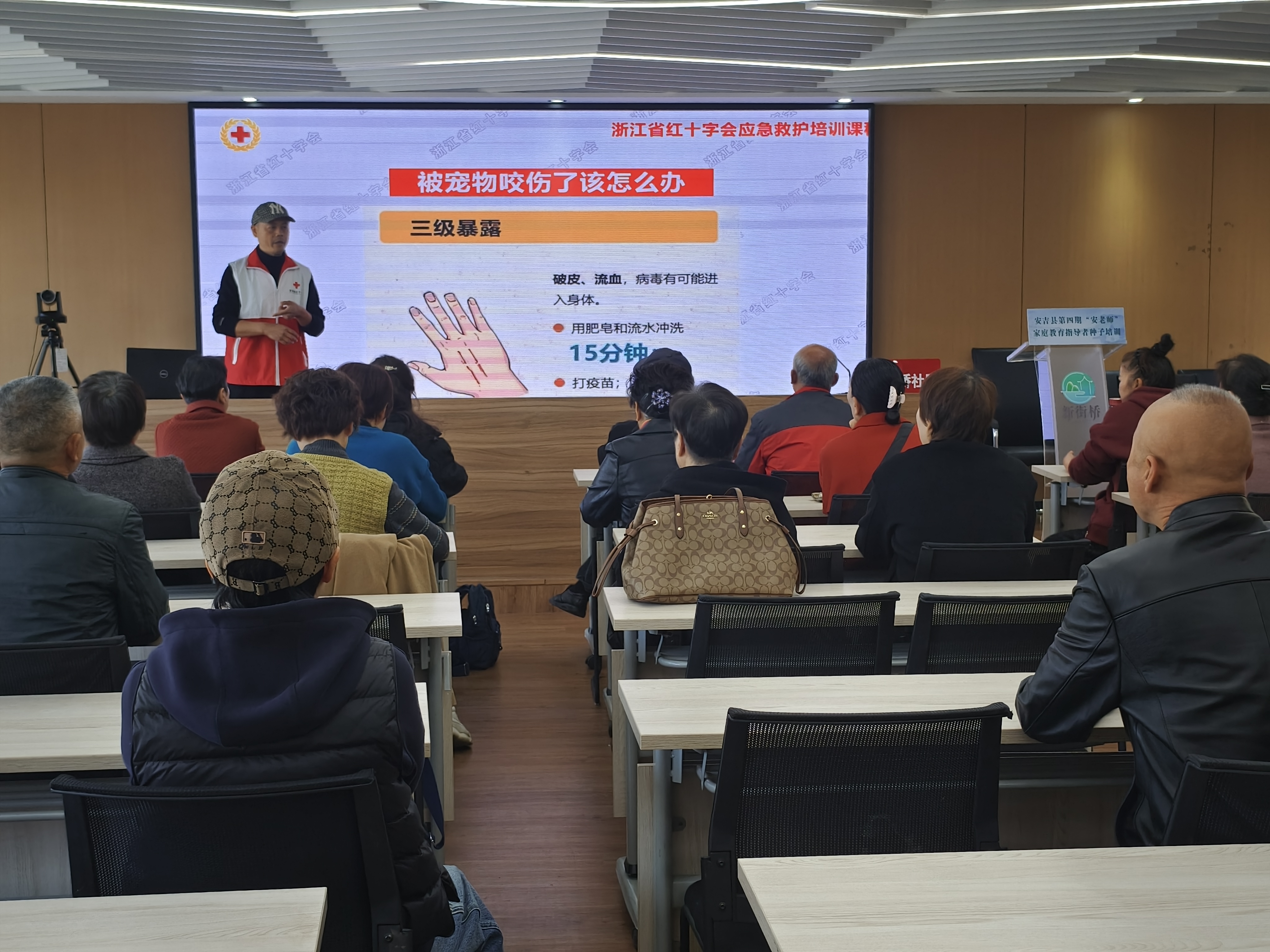 講座特邀浙江省紅十字一級應急救護師、昌碩分院特聘教師丁柏偉擔任主講。針對當前氣溫逐漸攀升,人們穿著日益清涼,寵物抓咬傷事件概率增加的情況,丁柏偉老師重點講解了狂犬病病毒的特征及其危害。