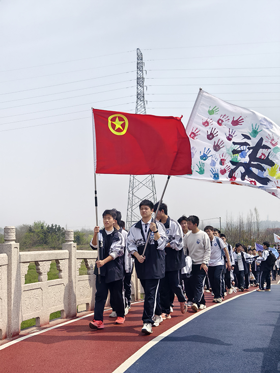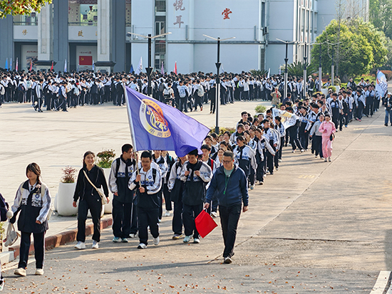 7時50分,文化廣場上口號嘹亮、旌旗獵獵。全體師生佩戴好青春毅行徽章,列成方陣整裝待發。校長吳曉彩在出征儀式上激情開講:“今天我們用腳步丈量家鄉熱土,用汗水澆灌青春理想。希望同學們在行走中讀懂江山發展的脈動,在堅持中淬煉新時代青年的擔當!”隨著“出發”令下,3000多名師生分三個團有序開拔,一面面班旗引領著蜿蜒的隊伍,如長龍般向著目標挺進。