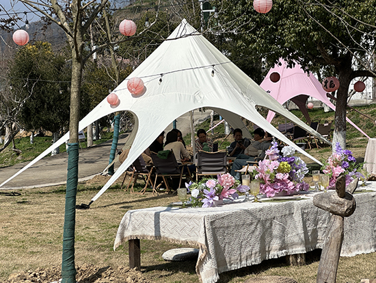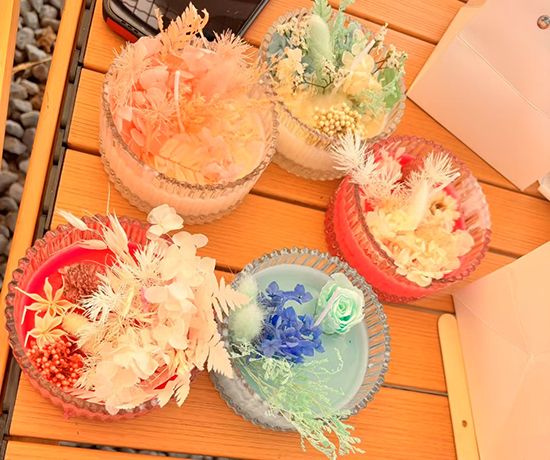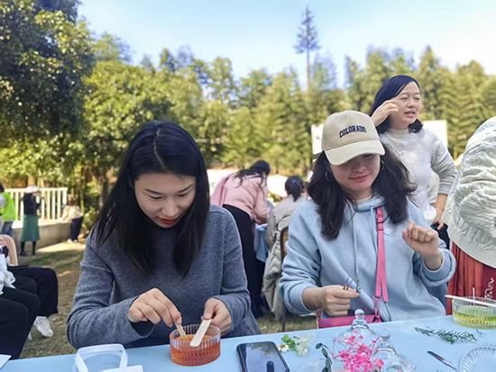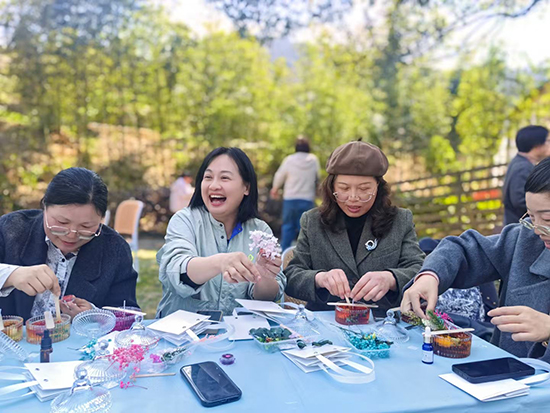 正午時(shí)分,女教師們圍坐于青瓦白墻的農(nóng)家院落,柴火灶蒸騰的煙火氣裹著時(shí)蔬鮮香,春日新采的蔬菜與竹林土雞煲熨帖著味蕾。午后陽光漫過竹簾,森系香薰蠟燭制作空氣中充滿松木與柑橘的清新,融蠟、調(diào)香、點(diǎn)綴干花,纖巧指尖流轉(zhuǎn)間誕生出專屬春天的芬芳記憶。圍爐煮茶時(shí)分,陶壺咕嘟聲應(yīng)和著枝頭早鶯啼囀,一盞清茶佐以干果,笑談聲里茶煙裊裊,將一日閑情定格成春日剪影。